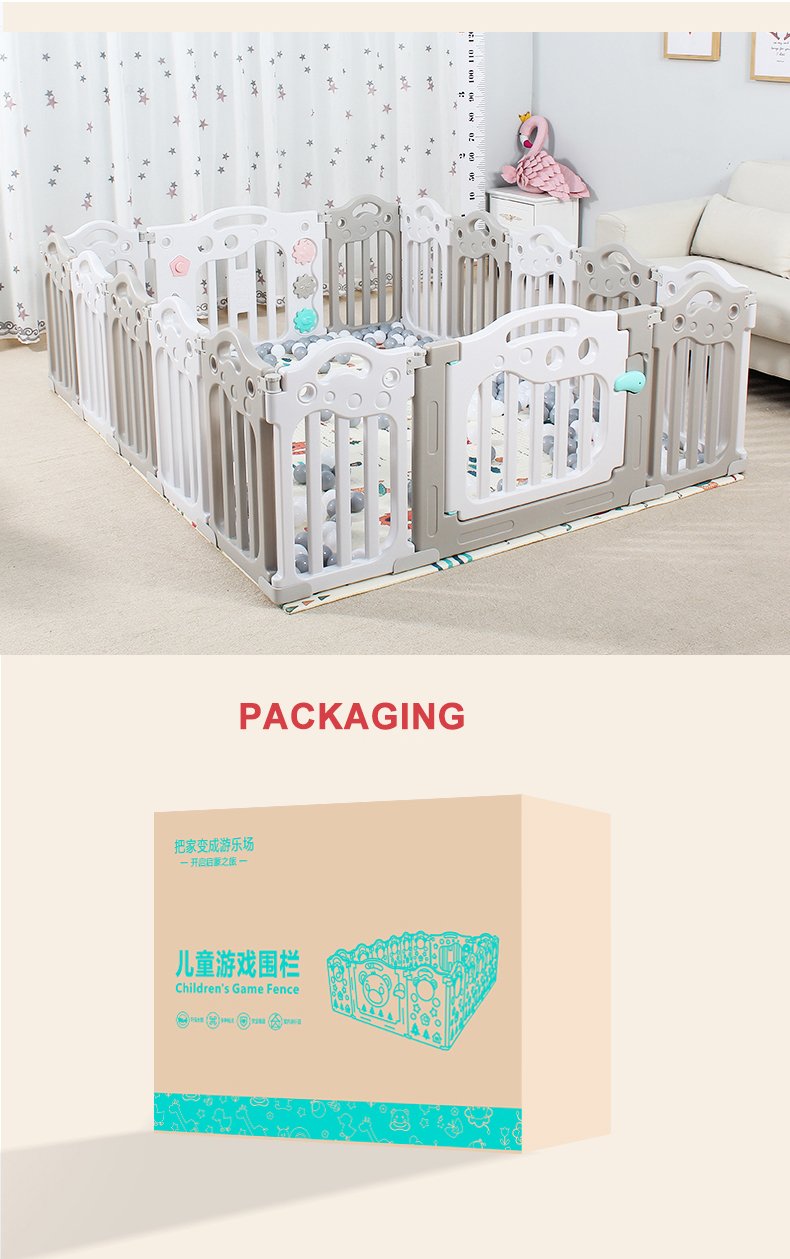 Kids’ Fashion Playpen: Minimalist, 60cmH×40cmW panels. Comes with play/gate panels (fastener-connected, easy to build) and bottom fixing boxes (anti-tipping). Encloses into a square, fit for bedrooms/playrooms. 2 colors: pink-blue-white/gray-white. Safe, stylish for toddlers!