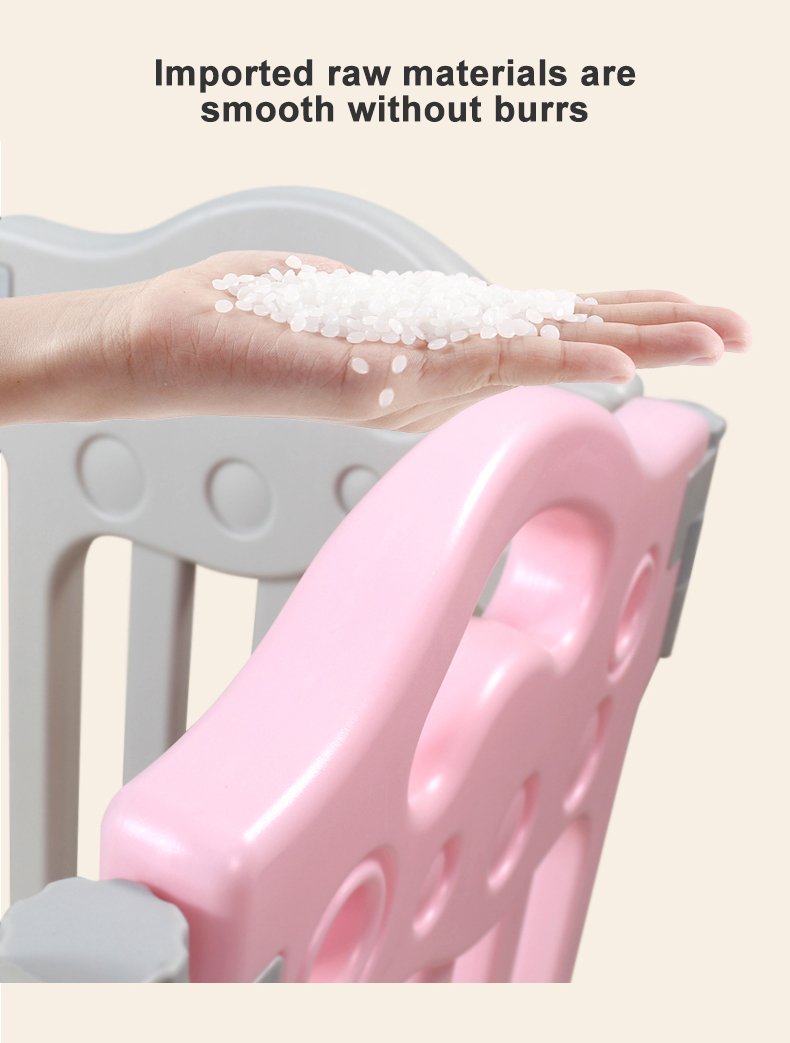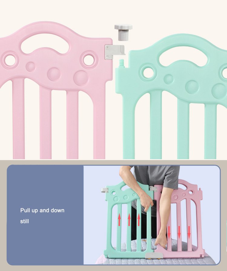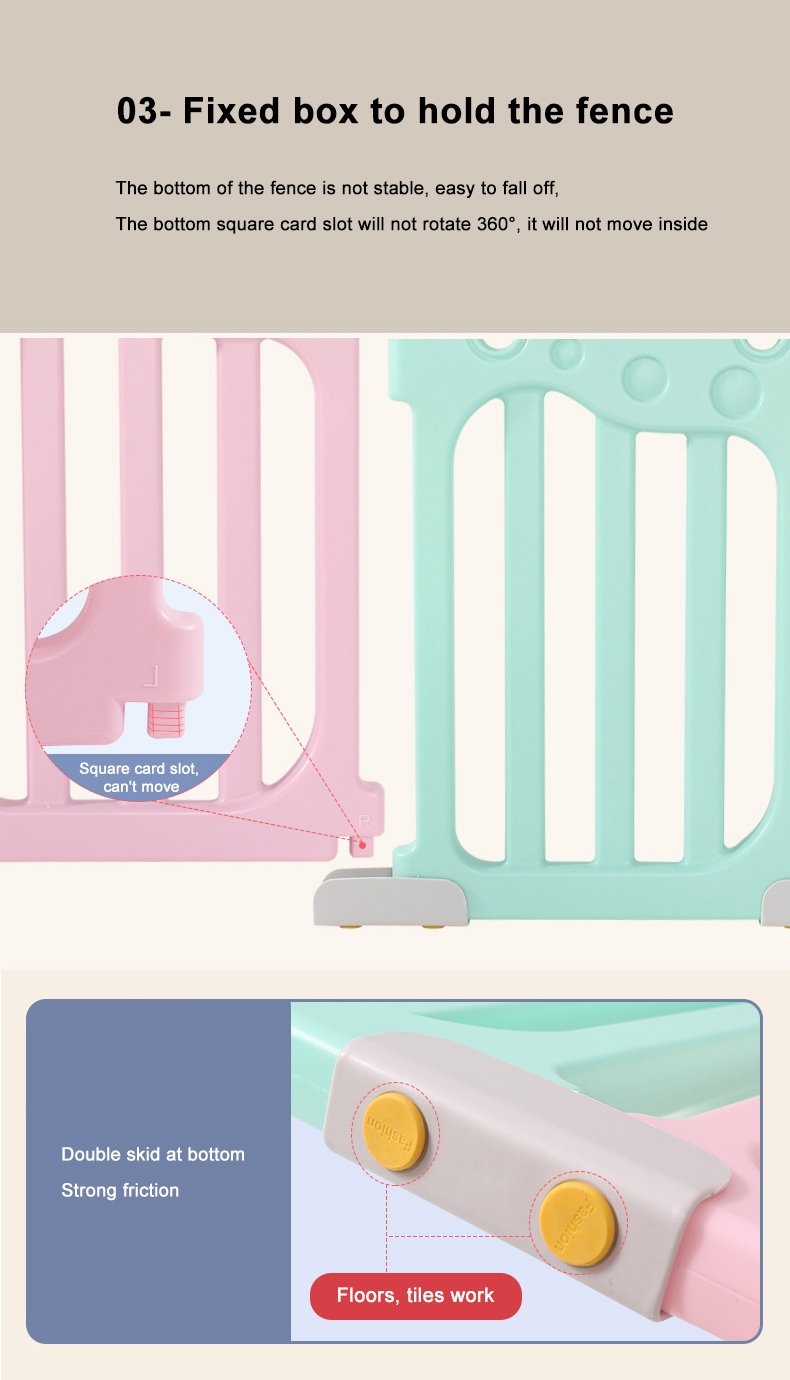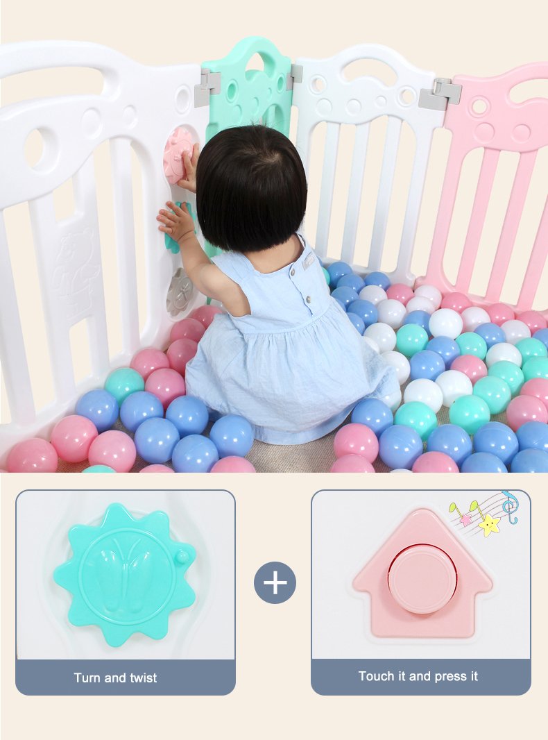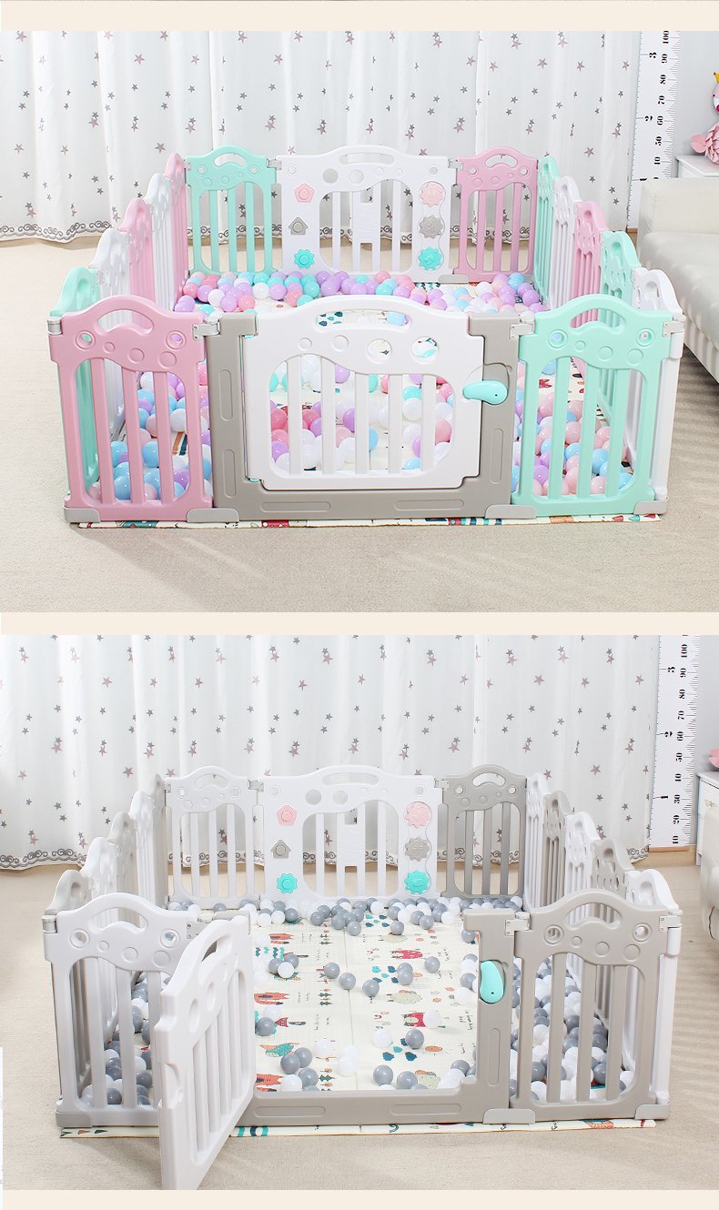 Kids’ Fashion Playpen: Minimalist, 60cmH×40cmW panels. Comes with play/gate panels (fastener-connected, easy to build) and bottom fixing boxes (anti-tipping). Encloses into a square, fit for bedrooms/playrooms. 2 colors: pink-blue-white/gray-white. Safe, stylish for toddlers!