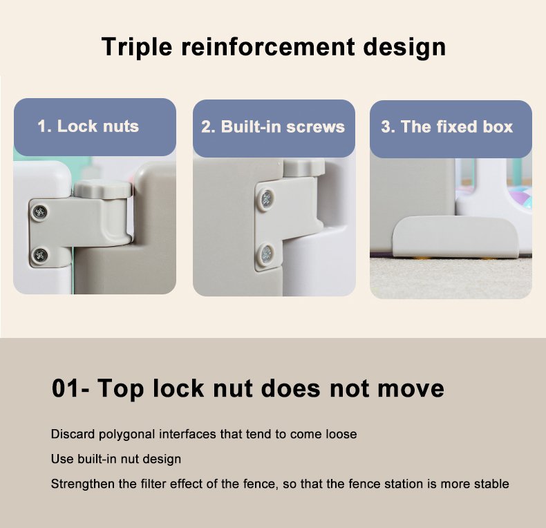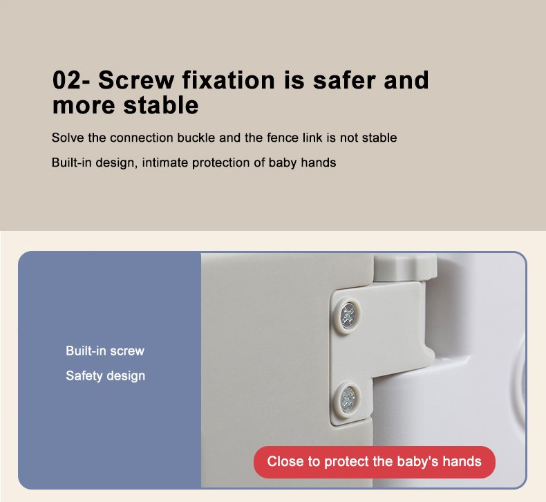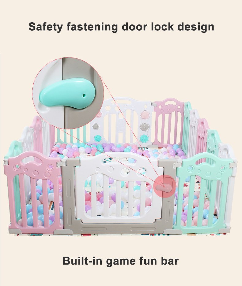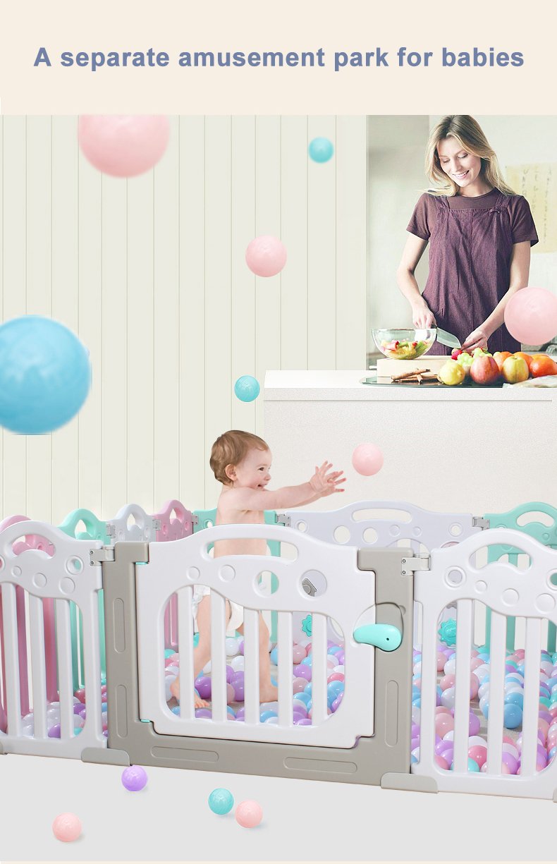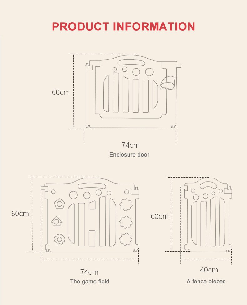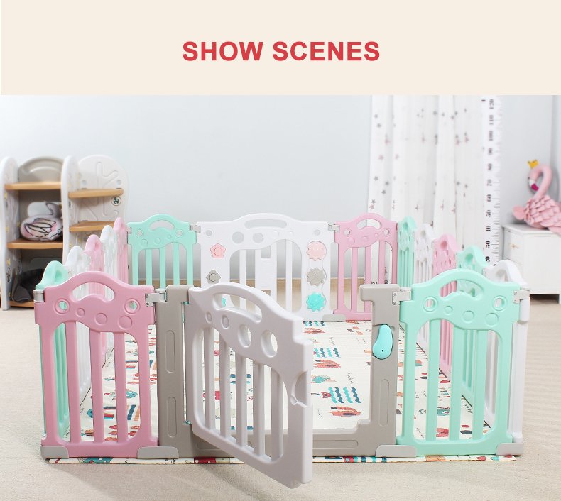 Kids’ Fashion Playpen: Minimalist, 60cmH×40cmW panels. Comes with play/gate panels (fastener-connected, easy to build) and bottom fixing boxes (anti-tipping). Encloses into a square, fit for bedrooms/playrooms. 2 colors: pink-blue-white/gray-white. Safe, stylish for toddlers!