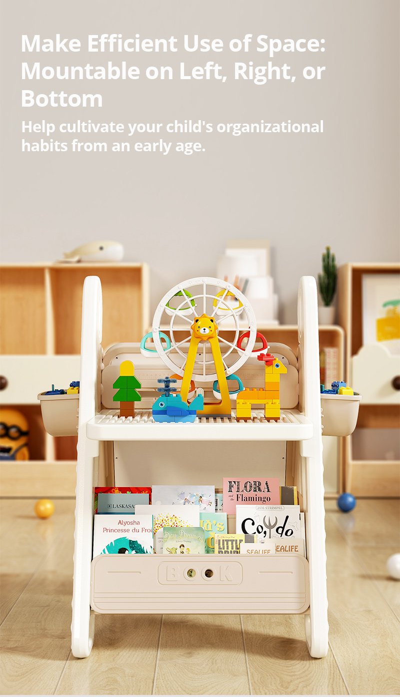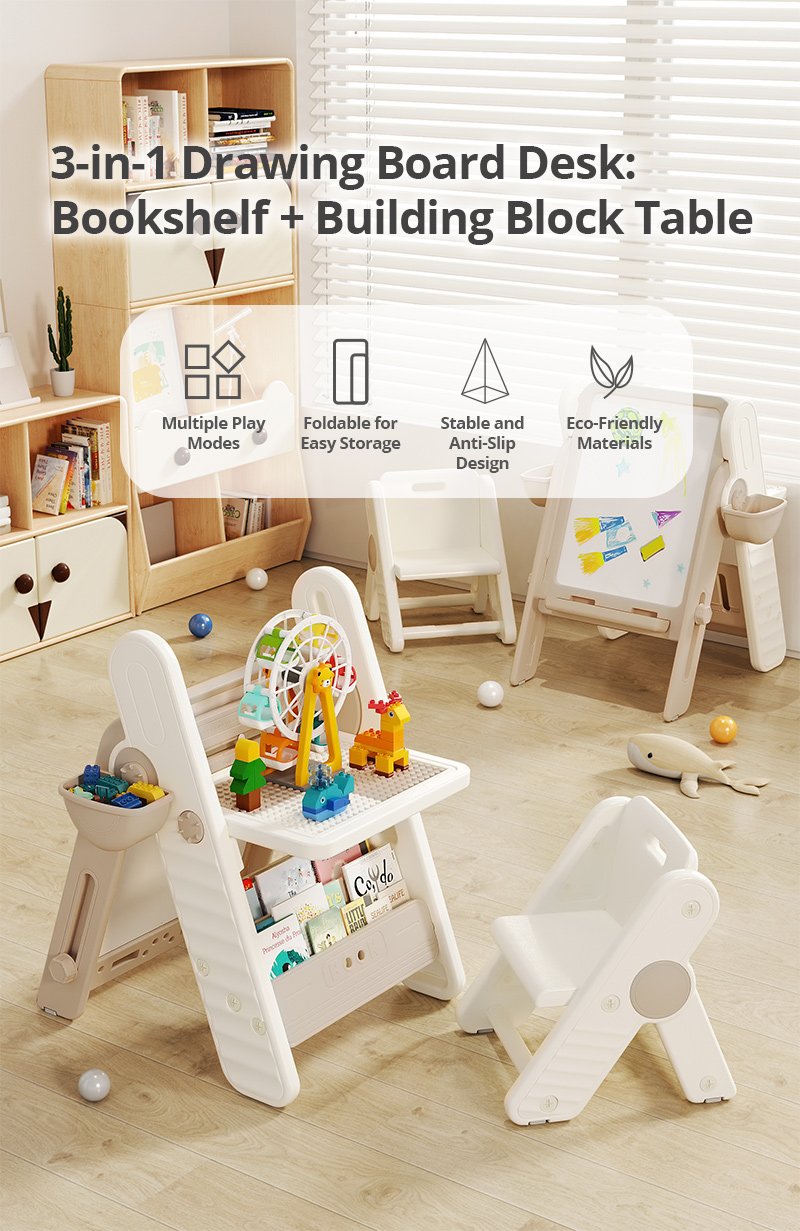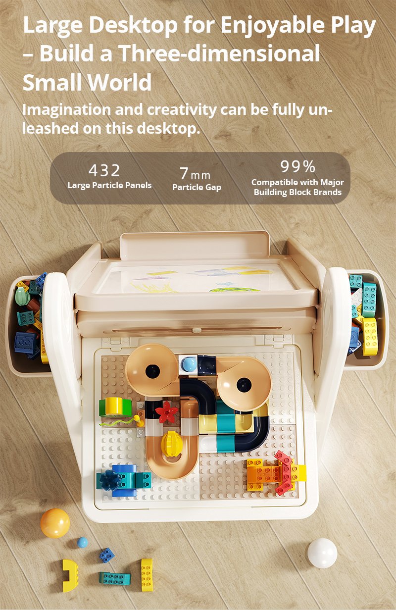 This multi-functional block table for ages 1-6 is a 4-in-1 station for building, drawing, writing, and storage. With trendy INS colors and a foldable design, it delivers tons of fun while saving space.