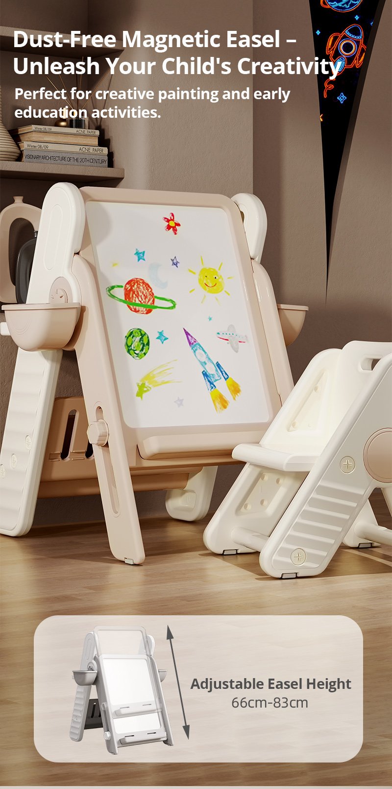 Dino-Shaped Kids Multi-Functional Drawing Board for Ages 1-6 – 2 Adjustable Heights, 5 Colors, INS Style, Dust-Free Easy Wipe