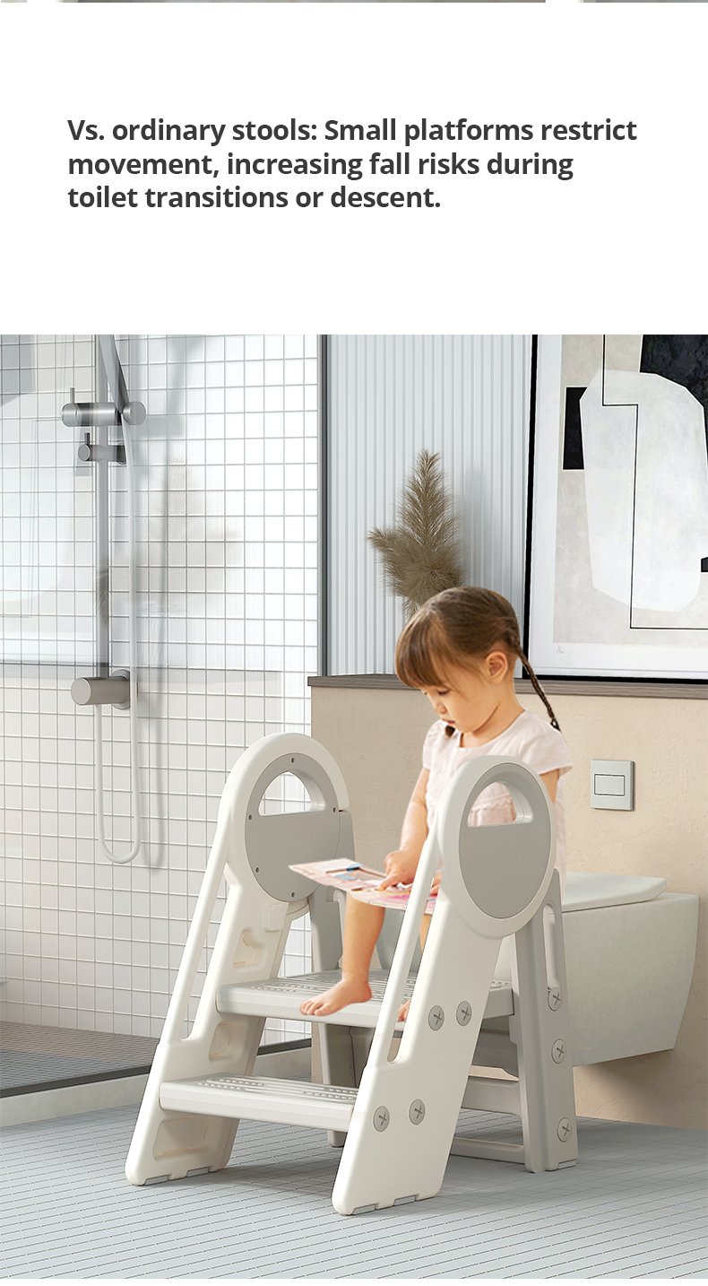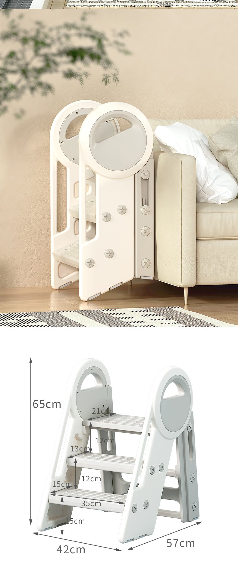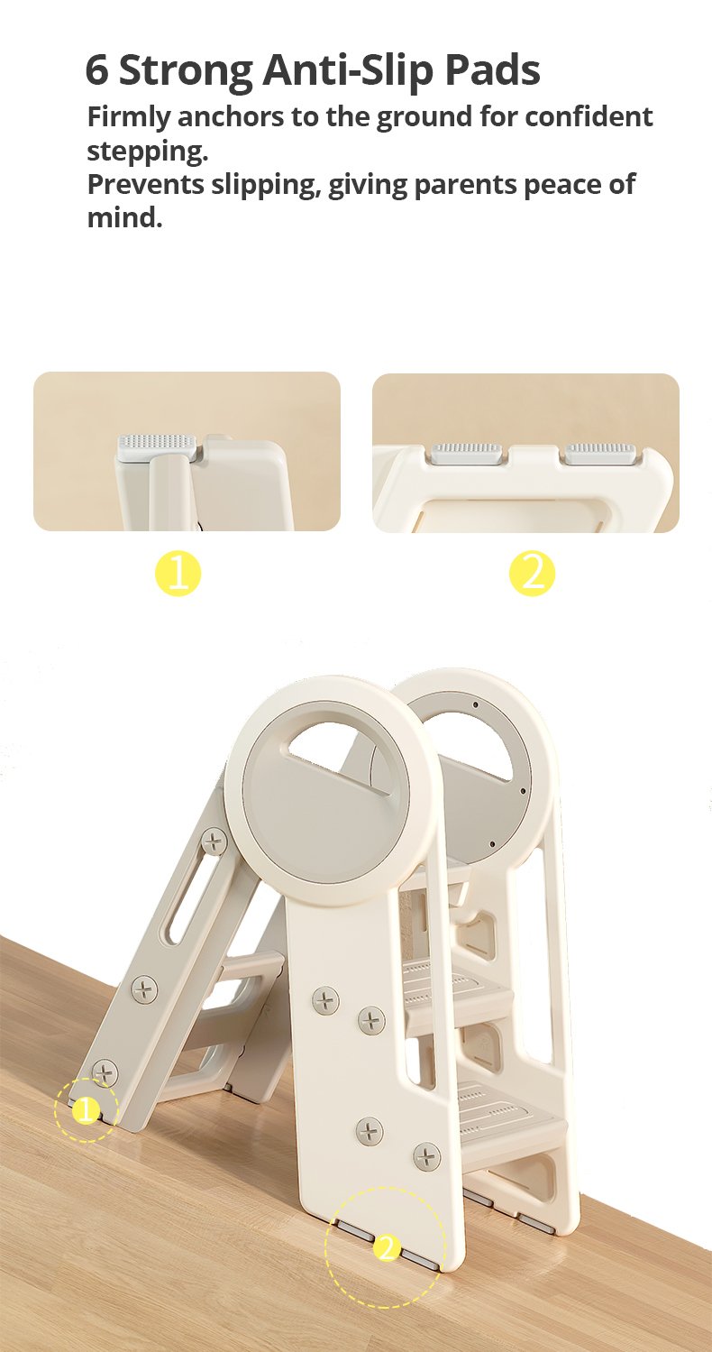 Furthermore, the stool folds completely flat for compact storage, saving valuable space when not in use. Despite its lightweight design, it securely supports up to 80KG. This combination of safety, functionality, and engaging design encourages toddlers to safely wash hands, access shelves, and participate in family activities. It is the ideal tool for building confidence and self-reliance in young children.