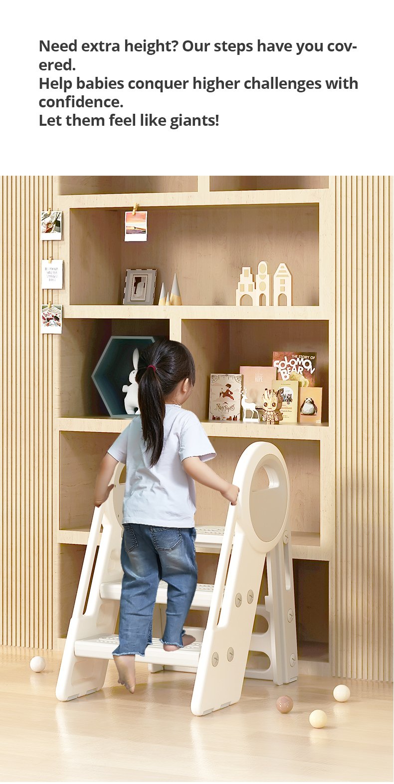The Toddler Step Stool Ladder safely helps children ages 1-6 reach new heights of independence. This versatile step stool works perfectly in bathrooms, bedrooms, and kitchens. It easily converts between two and three tiers to match different tasks. Children will love the fun astronaut-shaped side panels that make daily routines more exciting.